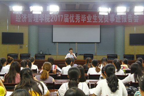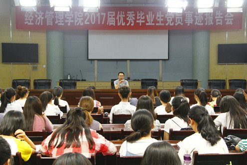 首先,王老师向参会同学介绍了6名优秀毕业生党员的基本情况,他们有的考上了研究生,有的考取了国家公务员,有的考取了选调生,有的进入国企工作。随后,6名同学先后上台与同学们分享了自己的学习、工作、生活经历。最后,王老师希望参会的党员同学和入党积极分子以本次事迹报告会为契机,在今后的学习、工作和生活中努力做好表率,发挥好模范带头作用,为经管学院发展壮大贡献力量。