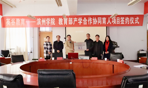 11月20日下午,教育部产学合作协同育人项目(英谷教育——滨州学院)签约仪式在申慱sunbet网站五号教学楼401室举行。滨州学院教务处处长姚志刚、招生就业处处长张文军、英谷教育总经理韩敬海、申慱sunbet网站院长郭新伟出席本次签约仪式。