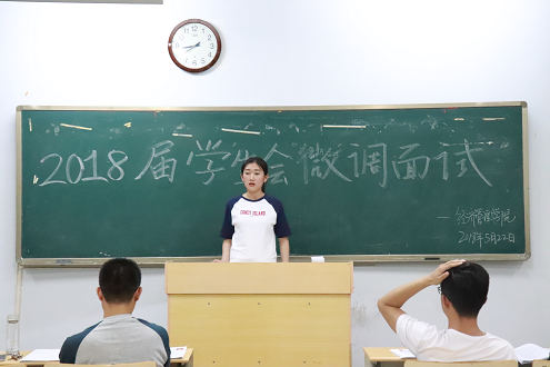 为遴选优秀人才加入学生会主席团队伍,推动学生会进一步发展,5月22日晚7时,申慱sunbet网站于7号教学楼409室进行2018届学生会主席团微调面试。我们学生科长王泰宁、现学生会主席团成员及各部门负责人担任本次微调面试的评委,24名同学参加本次面试竞选。