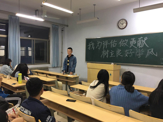 会上,班主任老师带领班级学生集体学习《本科审核评估知识手册》,向本班学生传达学校本科教学审核评估要求,讲解评估知识,阐明工作原则,严明校规校纪,引导学生全面了解本科审核评估的内容、意义和参与的主要途径。之后,班主任老师结合上学年综合测评和评奖评优数据,深刻分析检查班级学风中存在的短板,特别是一些严重影响班级学风的歪风陋习和慵、懒、散现象,努力引导学生营造 “人人勤奋学习,班班创优良学风”的良好氛围。随后,学生轮流上台发言,每人紧紧围绕“我为评估做贡献,树立良好学风”这一主题,从自身出发,结合实际生活,阐述了自己对学风的理解及可以为学风建设所做的力所能及的事情。同学们纷纷表示要主动用心地投入到学风建设活动之中,为学校的审核评估贡献自己的力量。