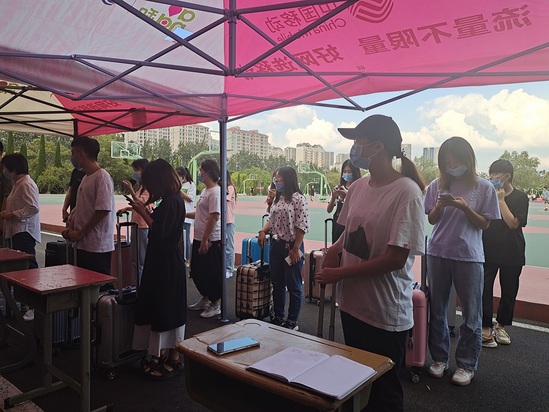 本次迎新模拟活动主要在第一报到点进行,新生均从学校北门进入,到申慱sunbet网站第一报到点(西侧篮球场地西侧南面),有序排队报到。工作人员首先对其行李进行消毒,然后有序接受体温检测,并且新生需出示大数据行程卡、健康通行码等,最后领取住宿通知单和公寓用品清单。报到后志愿者引导新生及其陪同家长进入公寓放置行李,宿舍报到完成后新生需携带身份证、录取通知书、毕业证书等相关证件前往第二报到点进行下一步登记。以上工作完成后,新生报到流程结束。