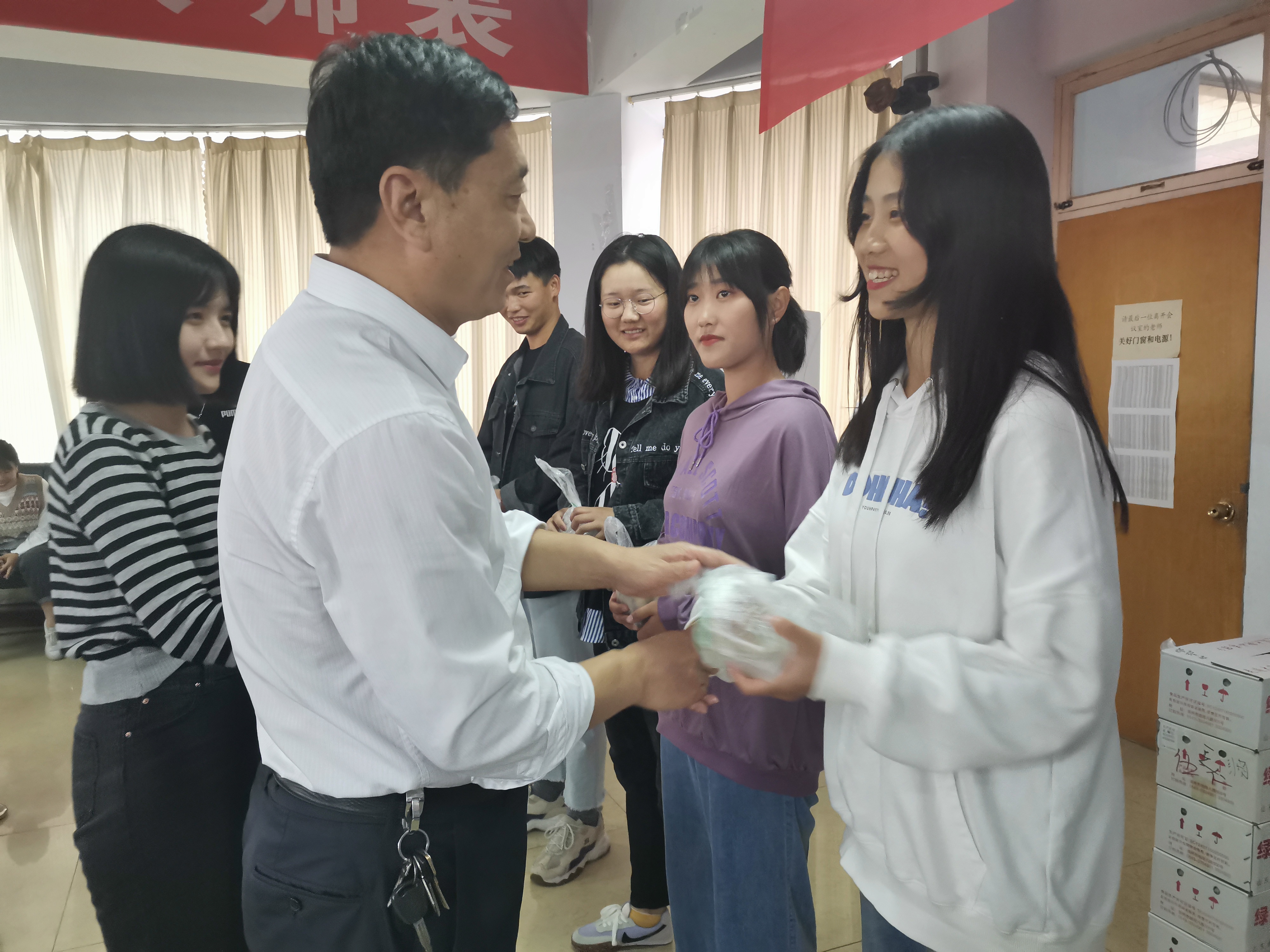 放了月饼,并将学院的祝福和问候带给了假期留校的各位同学,与大家一起共度中秋佳节。崔玉海书记鼓励同学们要坚定理想信念,自立自强、奋力拼搏,能担当、有作为,不负青春、不负韶华,勇于逐梦。当同学们收到这份饱含温情的节日礼品和祝福时,脸上洋溢着感动与喜悦,纷纷表示感谢学院的关心与关怀,自己一定会刻苦学习,努力拼搏,心怀感恩,勇担责任使命,在今后的大学生活中以实际行动回报学校、回报社会。