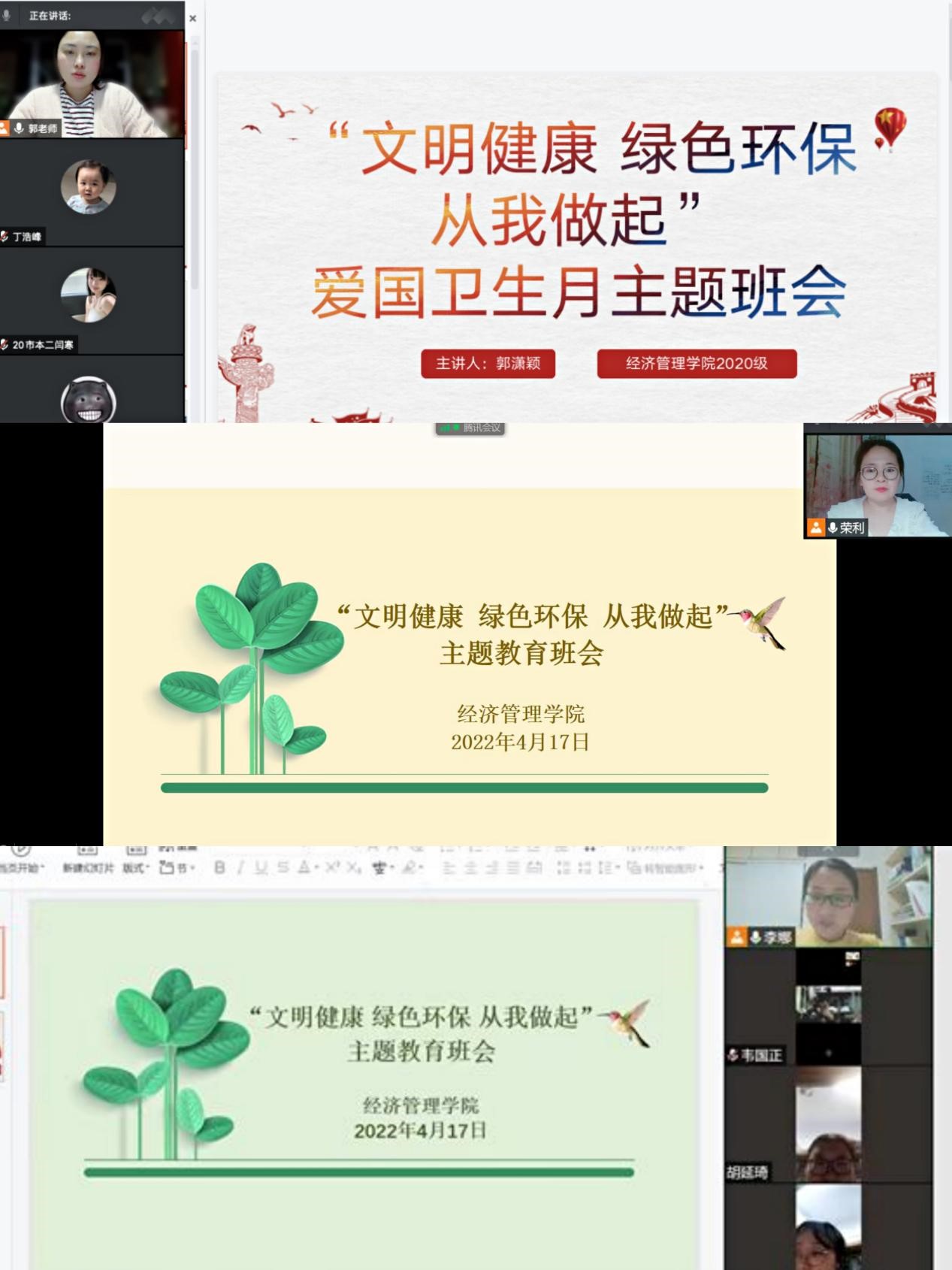 芳菲四月,春色旖旎。今年四月,我们迎来了第34个全国爱国卫生月。为贯彻落实习近平总书记关于深入开展新时代爱国卫生运动的重要讲话精神,坚持高校立德树人根本任务,培育和践行社会主义核心价值观,培养大学生树立正确的劳动观念,推动大学生形成文明健康、绿色环保的生活方式,筑牢常态化疫情防控的校园大防线,4月17日晚,申慱sunbet网站召开“文明健康绿色环保从我做起”线上主题教育班会,我们全体学生参加了此次班会。