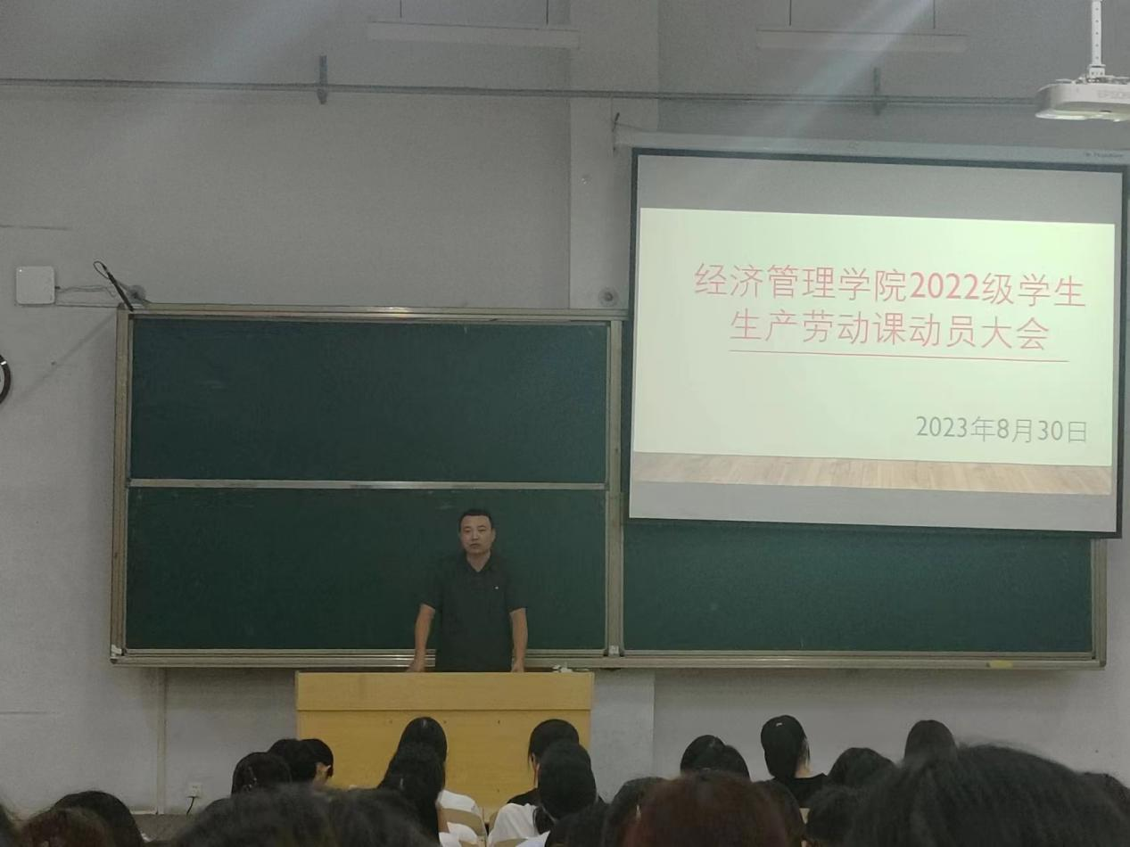 为促进学生树立正确劳动价值观,确保学生的生产劳动实践教学环节能够安全有序高质量进行,8月30日晚,经济管理学院在7教205室召开2022级学生生产劳动课动员大会。本次动员大会由经济管理学院学生科科长张智涛老师主持,2022级全体学生参加。