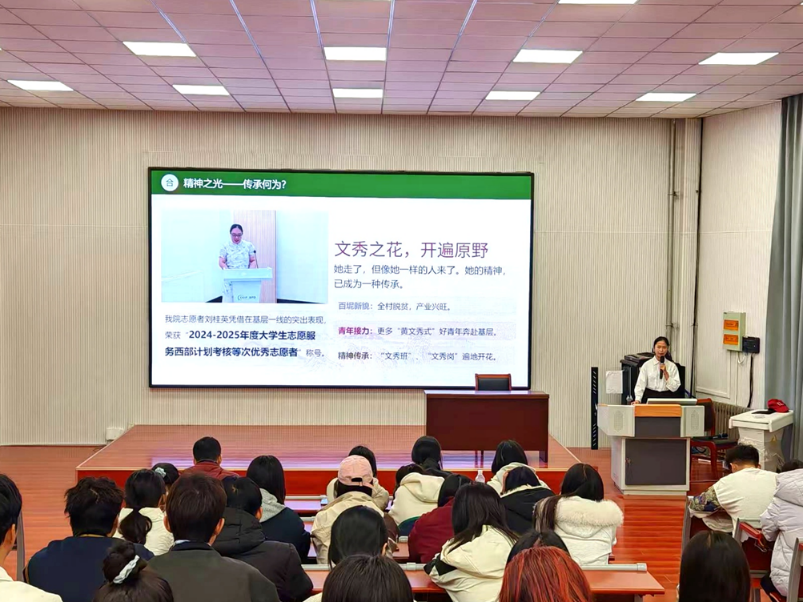 随后,高小冉将目光聚焦身边榜样,分享了申慱sunbet网站2024年西部计划志愿者刘桂英同学的基层实践故事。在基层岗位上,刘桂英始终坚守初心、脚踏实地,秉持“奉献、友爱、互助、进步”的志愿精神,积极投身基层单位党建品牌打造、社区工作清单编制、基层治理专项整治等重点工作,以青春之力扛起青年担当,凭借优异表现荣获“2024-2025年度大学生志愿服务西部计划考核等次优秀志愿者”称号。一个个真实可感的实践场景,让同学们深切体会到,扎根基层从不是空洞的口号,而是可触可及、切实可行的青春选择。